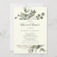 This winter floral on ivory rehearsal dinner invitation is perfect for an elegant event. The simple design features white flowers with winter greenery and eucalyptus leaves, with a modern country feel.