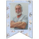A winter-themed bunting banner featuring snowy mountains, falling snow, evergreen trees, and watercolor polar bears, with elegant script typography, a soft pastel color palette, and a serene Arctic wilderness atmosphere; perfect for a winter birthday party celebration. Customize by adding your own photo of the honored birthday person.