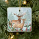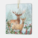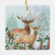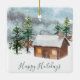 This design features an illustration of winter forest - pine trees, deer and log cabin, covered with snow