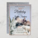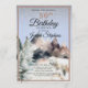 A winter-themed birthday invitation featuring snowy mountains, falling snow, evergreen trees, and watercolor polar bears, with elegant script typography, a soft pastel color palette, and a serene Arctic wilderness atmosphere; perfect for a winter birthday, milestone celebration, rustic winter party, or nature-inspired event.