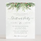 Beautiful affordable Christmas party invitation for the holiday season, featuring hand-painted botanical watercolor illustrations of winter greenery, pine and spruce branches, cones and holly berries.