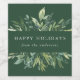 Elegant, botanical wine labels featuring the greeting "Happy Holidays" and your name framed by green watercolor foliage on a dark green background. The greenery wine labels are perfect for holiday parties!