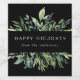 Elegant, botanical wine labels featuring the greeting "Happy Holidays" and your name framed by green watercolor foliage on a black background. The greenery wine labels are perfect for holiday parties!