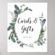 This winter greenery wedding cards and gifts sign is perfect for an elegant wedding. The simple fall or winter design features a modern watercolor greenery wreath and dark olive leaves with a rustic holiday feel.