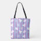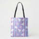 Cute holiday bag with white snowflakes, purple and blue stripes,, white mittens and winter hats.