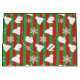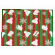 Christmas bag with red and green background, white mittens, hats and snowflakes.