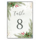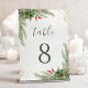 Beautiful wedding table numbers featuring hand-painted botanical watercolor illustrations of winter greenery, pine and spruce branches, cones and holly berries with faux gold glitter. Perfect choice for winter or Christmas holiday themed weddings.