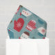 A fun holiday pattern of cosy winter mittens. Some have a knit look to them, others have a simple snowflake. The colour scheme is red, brown, white and pretty shades of blue. The background is a light blue with a subtle snowflake pattern. These tissues add a cheerful festive touch to your Christmas gift bags.