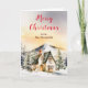 This beautiful and festive watercolor Christmas card can be personalised with your family name. It features a rustic winter cottage surrounded by snow, mountains and trees. There are adorable animals, such as a cat and deer, and also mushrooms, acorns and foliage. The text combines handwritten script and sans serif fonts for a stylish and modern look.