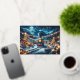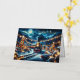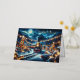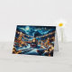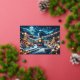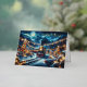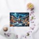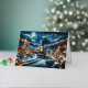 A lovely watercolor image of a nighttime winter scene with a vintage steam locomotive arriving at a station adorned with festive Christmas lights. Snow blankets the ground and rooftops, and the backdrop features towering mountains under a starry sky with a full moon. The warm glow of the train’s headlamp and the twinkling lights create an inviting and cosy holiday atmosphere, evoking feelings of nostalgia and celebration associated with the Christmas season.