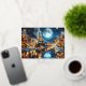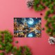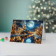 A lovely watercolor image of a nighttime winter scene with a vintage steam locomotive arriving at a station adorned with festive Christmas lights. Snow blankets the ground and rooftops, and the backdrop features towering mountains under a starry sky with a full moon. The warm glow of the train’s headlamp and the twinkling lights create an inviting and cosy holiday atmosphere, evoking feelings of nostalgia and celebration associated with the Christmas season.