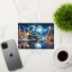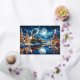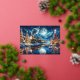A lovely watercolor image of a nighttime winter scene with a vintage train emitting steam on the left, travelling alongside a frozen river. Snow-covered trees and decorated buildings with lit windows suggest a small village. A large, brightly lit Christmas tree stands prominently in the centre, adorned with colourful lights and a star on top. The full moon illuminates the sky, casting reflections on the river’s surface. This vibrant depiction of a classic holiday setting evokes a sense of warmth and nostalgia.