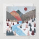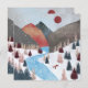 A beautiful landscape with unique textures showing a river and mountain landscape with a fox in md-jump hunting in the snow in shades of red, green, blue, and beige.