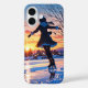 Beautiful anime-inspired phone case depicting a girl ice skating on a frozen pond surrounded by snowy trees with golden sunset reflections. Perfect for scenic and festive winter designs.