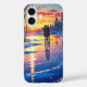 Minimalist anime-inspired phone case depicting a frozen lake with ice skaters surrounded by snowy trees and golden sunset reflections. Ideal for scenic and festive winter designs.