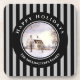 Watercolor painting of a winter scene in New England, a quiet day when the snow has just fell into the ground. Quite picturesque and peaceful. The design has black circle frame around it with personalised texts on the top and lower side. The design has vertical grey and black stripes pattern. Customisable in Zazzle with your own text for a personalised design. Check out my store for matching items!