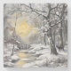 Snowy winter forest painting capturing a sunset moment with a water spring crossing the white ground, a house, and a deer hiding behind a tree.