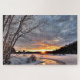 This jigsaw puzzle features a beautiful winter landscape with sunset, river and snow. Great for the holiday and Christmas season.