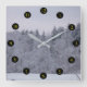 This clock features a photograph of a snow covered hillside with various types of trees (both deciduous and evergreen). There are a number of pine trees and all of them are covered in a blanket of snow. The grey sky above and white snow covered field below give a nice contrast with the trees. A beautiful winter landscape for anyone who loves the season.
