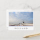 Photo postcard of a minimalistic view on a winter landscape in Holland with a path and a canal toward a windmill under a layer of snow with nice clouds at sunrise in the dutch countryside with a white border and in a white box the text 'Holland' and with stripes in the colors red, white and blue, the colors of the dutch flag.