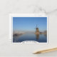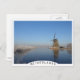 Postcard of a landscape in the countryside in the Netherlands with a windmill, ice on the river and frosted reeds under a clear blue sky with a white edge and in black the curved text 'Netherlands'.