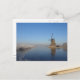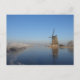 Postcard of a landscape in the countryside in the Netherlands in winter with a windmill, ice on the river and frosted reeds under a clear blue sky.