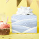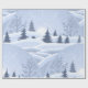 This winter landscape shows a frozen lake surrounded by snow-covered hills and trees. The design has a circular pattern with a sunburst in the sky. The colour scheme is blue and white.