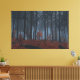 A stand of trees on an overcast winter day. The tall trees are bare and leafless, but the saplings underneath still have their brown leaves. The still-clinging and fallen leaves in shades of almost-pink provide a contrast to the dark trunks and foggy blue haze above.