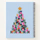 A cute colourful Christmas tree in a baby blue background, featuring abstract shapes with a mid century modern design. A festive and modern design for the Christmas season.