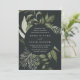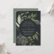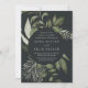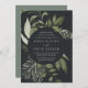 Our Winter Meadow wedding invitation surrounds your wedding day details with a circular border of vibrant watercolor foliage A modern yet organic choice for winter or spring weddings featuring intricately painted botanical elements. Colorway: Winter Meadow, a dark and moody blend of muted dusty sage green, fern, and olive green foliage on a soft black background.