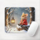 A cute mouse dressed in a red coat and scarf sits on a snow-covered tree stump, looking at a glowing lantern, surrounded by a winter forest
