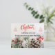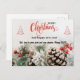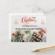 This sophisticated holiday postcard combines elegant typography with a beautiful natural winter photograph. The design features "MERRY Christmas" at the top, with "Christmas" written in flowing red calligraphy, complemented by delicate line-drawn Christmas trees on either side. The greeting continues with "And happy new year" and an inspirational message "Let's toast to fresh starts and new chapters. Happy 2025!" The bottom half showcases a stunning close-up photograph of frosted pine cones, red winter berries, and snow-dusted evergreen branches, creating a serene winter atmosphere.