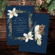 Winter pine cones and white flowers on a navy blue with elegant script wedding invitation.