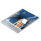 Winter night landscape. Cozy house, various trees, spruce and the moon in the sky. Color vintage illustration.