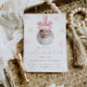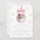 Girl 1st birthday invitation for a winter 1st birthday theme. Include a photo of the 1st birthday girl in a pink ornament surrounded by gold and pink snowflakes.