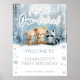 Winter Onederland Bear Baby Blue First Welcome Sign — a frosty-blue welcome board featuring a cuddly watercolor bear, wolf, and raccoon surrounded by soft snowflakes. It is fully editable so you can add your little one’s name, photo, and party details in seconds before printing in any size, designed by CaMiDesigns. For orders, shipping, product information, and further assistance, please contact Zazzle Customer Care directly.