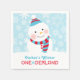 Winter wonderland "ONEderland" first birthday party napkin design features a happy winter snowman wearing a hat and scarf and custom text. The background has a pattern of snowflakes. Ice blue, turquoise, red, and white colours with black and grey accents.