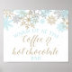 Winter Onederland first birthday warm up at the coffee and hot chocolate bar sign with blue and gold snowflakes.