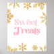Winter Onederland birthday party with pink and gold snowflakes, sweet treats sign.