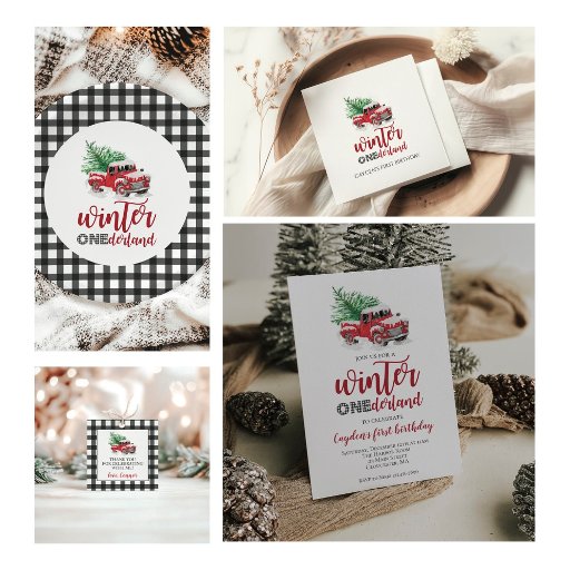 Winter Onederland first birthday party with red truck and black buffalo plaid.