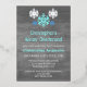 Winter onederland snowflake first birthday invitation for a baby boy . Features blue snowflakes against a rustic country barn wood background.