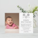 Winter onederland snowflake first birthday invitation for a baby. Features grey snowflake background. Photo template licensed via Pixabay under CC0 and must be replaced with your own photo