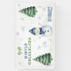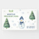 Watercolor kids birthday. Watercolor snowman, snowflakes, evergreen pine trees, green bow.