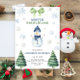 Watercolor Snowman 1st Birthday Day. Watercolor pine trees, snowman, green bow and snowflakes.