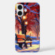 Stunning anime phone case showing a cosy bench in a snowy park with lamplight and colourful leaves mixed with snow. Perfect for scenic and tranquil winter scenery.