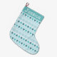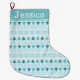 Winter pattern with rows of pine trees and snowflakes on light blue and teal personalised Christmas stockings.