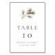 Rustic winter wedding table number cards featuring a watercolor illustration of a pine tree branch with green pine leaves and a pine cone. Add table number and personalise with your details in dark grey.