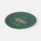 Elegant Kelly green coloured holiday paper plates with a gold tone ring edging and gold tone graphics of a pine cones and pine branch, in the middle. Merry Christmas in golden tan text is ready to personalise with your message.