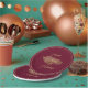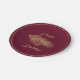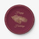 Elegant burgundy coloured holiday paper plates with a gold tone ring edging and gold tone graphics of a pine cones and pine branch, in the middle. Happy Holidays in golden tan text is ready to personalise with your message.