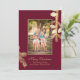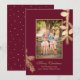Festive holiday photo greeting card done in a deep berry red, with graphics of gold tone pine branches and pine cones. Personalise with your photograph and text for a lovely way to send your greetings this holiday season.